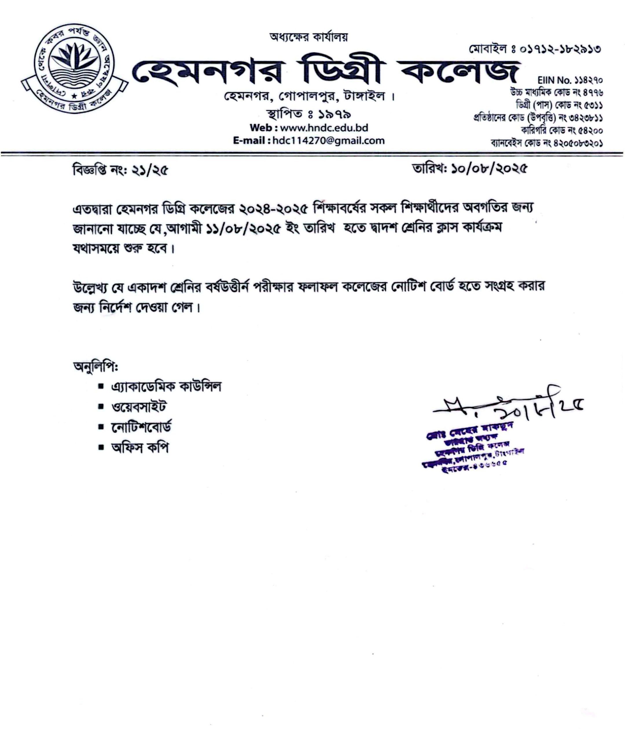 আগামি ১১-০৮-২০২৫ ইং তারিখ হতে দ্বাদশ শ্রেণির ক্লাস শুরু হবে