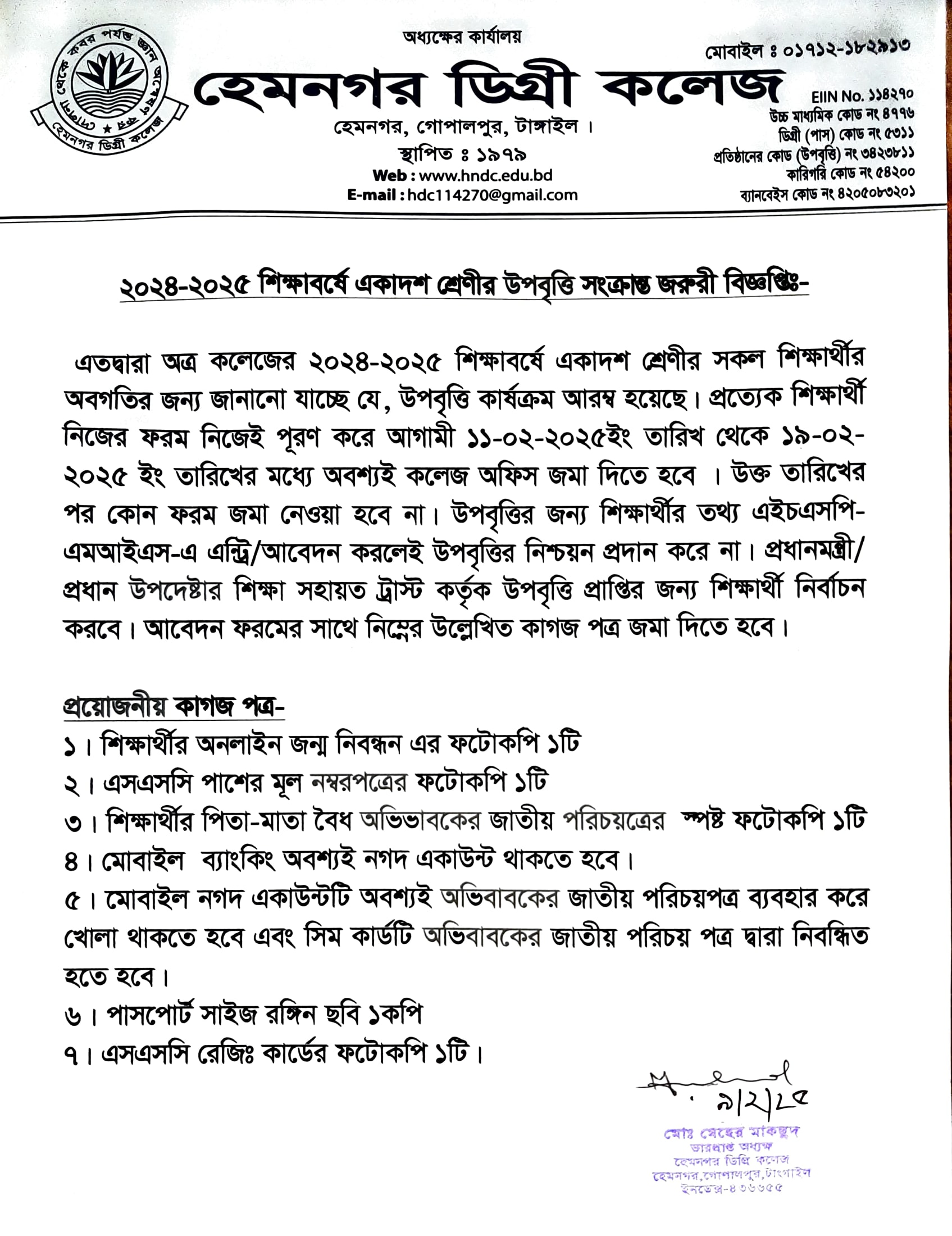 ২০২৪-২০২৫ শিক্ষাবর্ষের একাদশ শ্রেণির উপবৃত্তি সংক্রান্ত জরুরী বিজ্ঞপ্তি